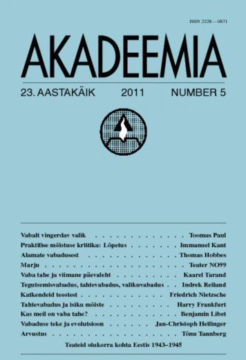 Vabalt vingerdav valik . Toomas Paul Praktilise mõistuse kriitika: Lõpetus . Immanuel Kant Alamate vabadusest . Thomas Hobbes Marju . Teater NO99 Vaba tahe ja viimane päevaleht . Kaarel Tarand Tegutsemisvabadus, tahtevabadus, valikuvabadus . Indrek Reiland Katkendeid teostest . Friedrich Nietzsche Tahtevabadus ja isiku mõiste . Harry Frankfurt Kas meil on vaba tahe? . Benjamin Libet Vabaduse teke ja evolutsioon . Jan-Christoph Heilinger Arvustus . Tõnu Tannberg Teateid olukorra kohta Eestis 1943–1945